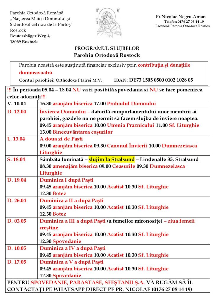 Pentru programări la Botez, Cununie, Spovedanie, Parastase, Sfeștanie/Sfințirea Caselor – Botezul Domnului sau pentru alte slujbe, va rugăm să îl contactați pe pr. Nicolae (0176 27 08 14 19)